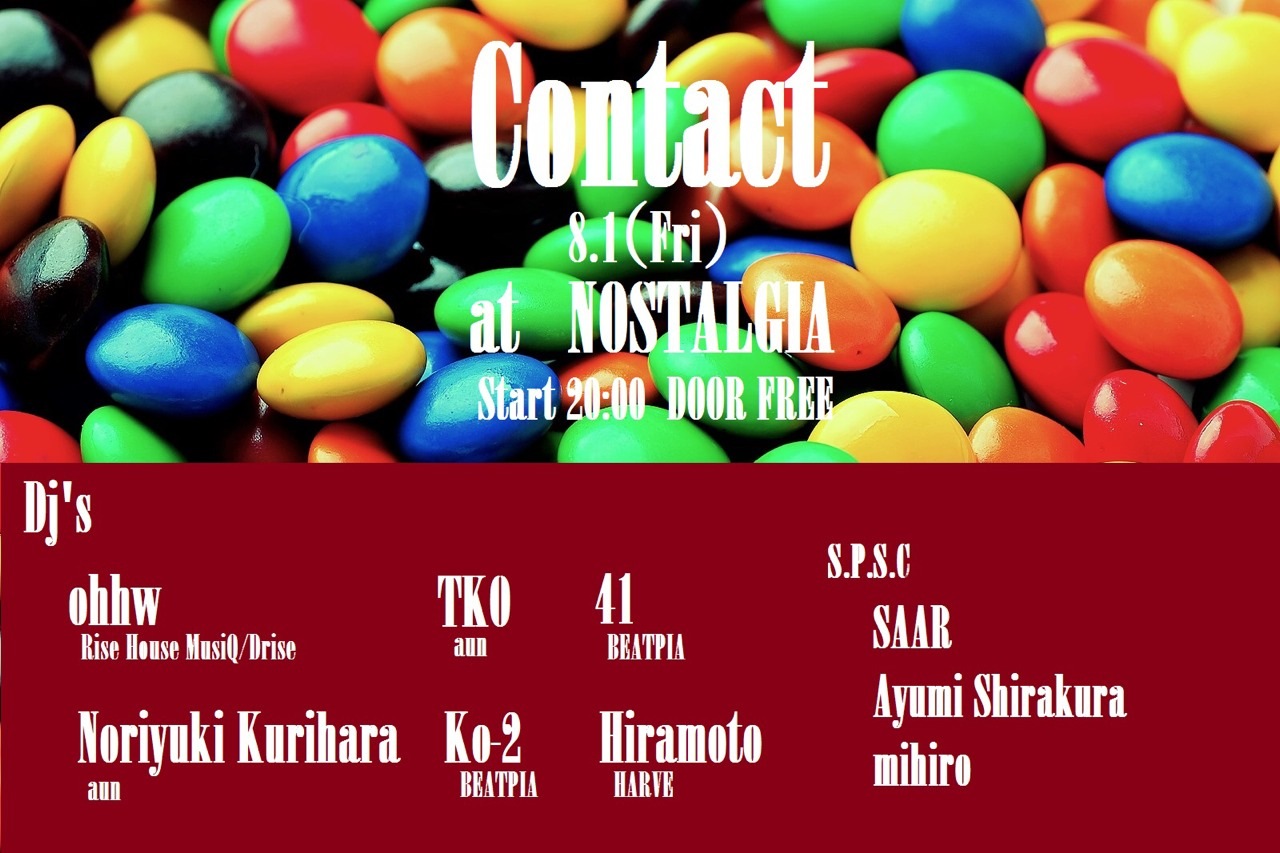 普段は通常営業中のラウンジスタイルでやっているcon tact.ですが、八月はパーティースタイルにての開催 です!朝まで遊びましょう!ゲストも個性豊かなメンツで すので、楽しめると思います!御殿場お祭りの前夜!8. 1は御殿場ノスタルジア集合でお願い致します。